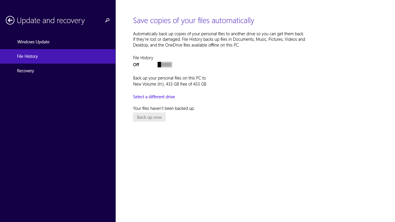 A screen similar to the one above should appear. Click on the "Off" button to flick the switch to "On" for File History.