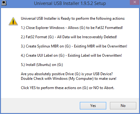 A message will appear confirming that you want to create the drive and you are warned again that all the data on the target drive will be deleted.