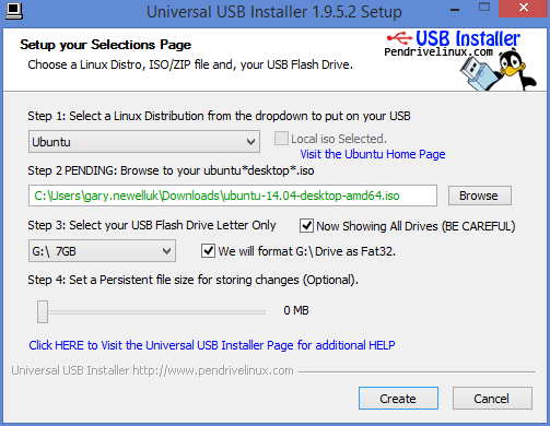 At this point you can create the USB drive so that it persists data. This makes it possible to install software when using the live Ubuntu version and it will still be available the next time you boot from the USB drive.