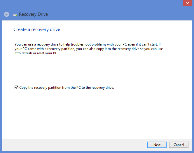 When the "Create a recovery drive" window appears click "Next" to continue.